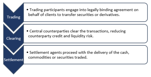 Within the trading value chain, clearing occurs after trading and before the settlement of trades, as part of the post-trade processing (please see Figure 1). Traditionally, the clearing phase was executed bilaterally between buy-side and the sell-side firms. In a derivatives transaction, the parties would agree to an exchange of the underlying securities for cash on a specific date. The period of time between trading and settlement during the life of the derivatives contract would expose the two parties to counterparty credit and liquidity risks. In order to limit the impact of those risks, special purpose entities called Central Counterparties (CCPs) were created to legally interpose themselves in the transaction, acting as an intermediary between buyers and sellers of financial instruments, becoming the buyer to every seller and the seller to every buyer.